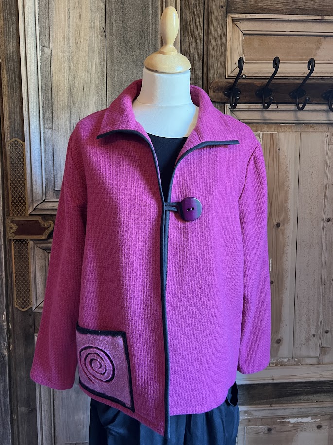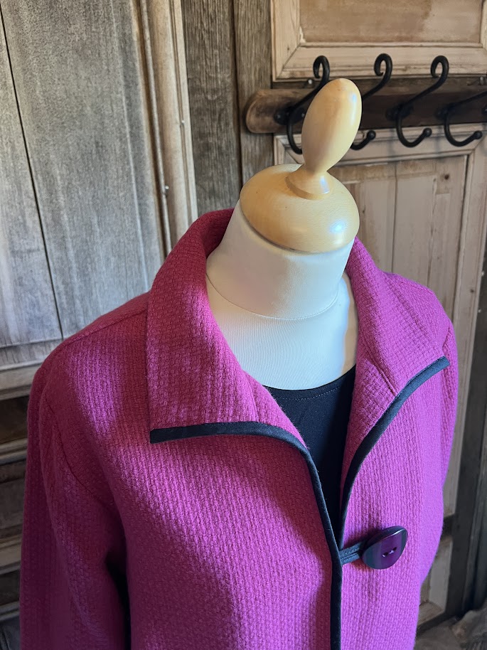 Het jasje heeft een aangename geweven textuur. De mooie kleur wordt prachtig geaccentueerd door zwarte biezen langs de kraag, revers en de voorsluiting, wat zorgt voor een verfijnd contrast.