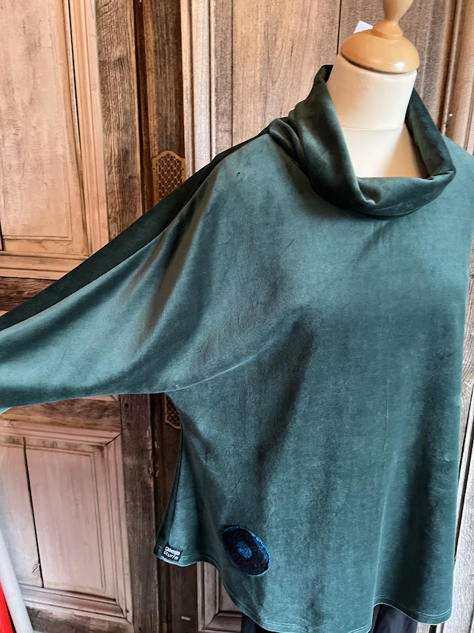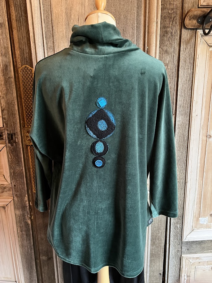 Let op de opvallende vilt applicaties, waardoor u een uniek en artistiek kledingstuk in huis haalt.