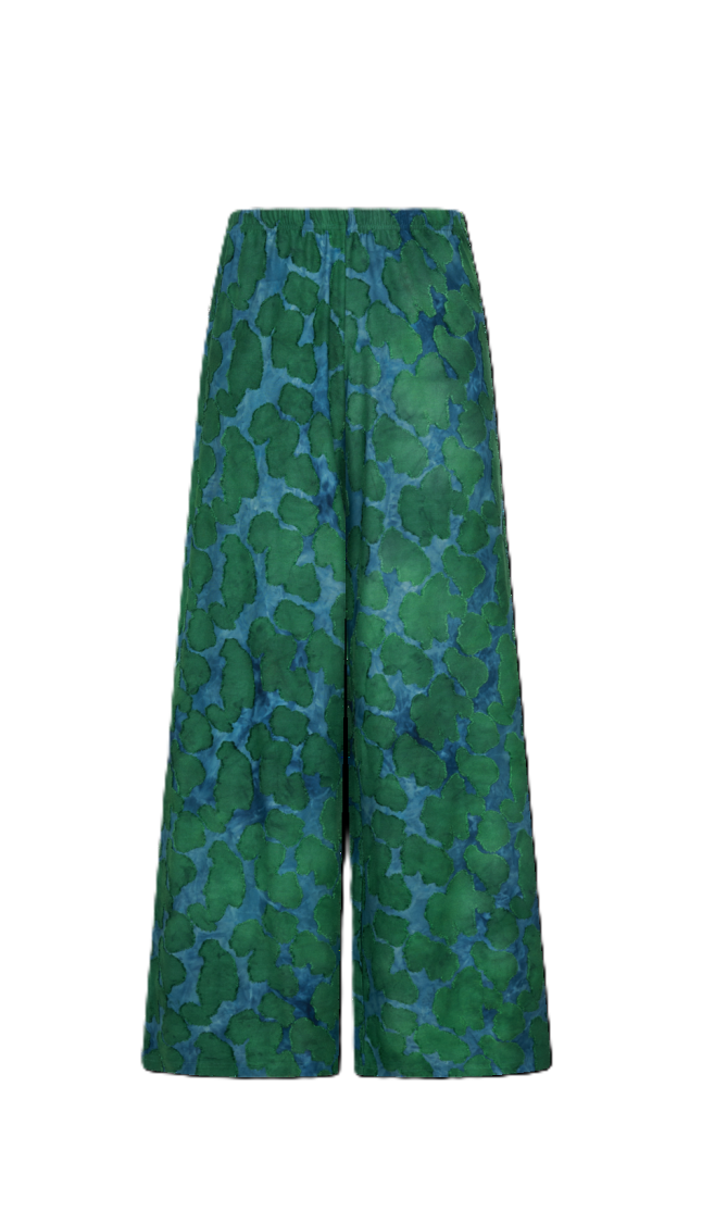 Lange broek met wijde pijpen gemaakt van een unieke stretchstof. Het heeft een elastieken band in de taille waardoor hij heel comfortabel past.
