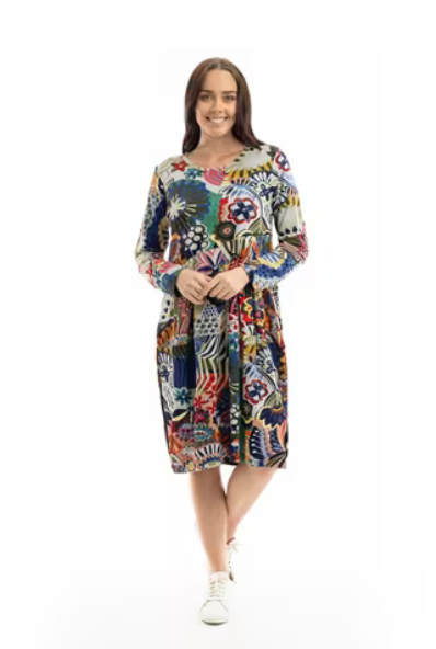 De bubbeljurk van Orientique heeft een ronde halslijn, lange mouwen, een diagonale taillenaad en praktische zakken.